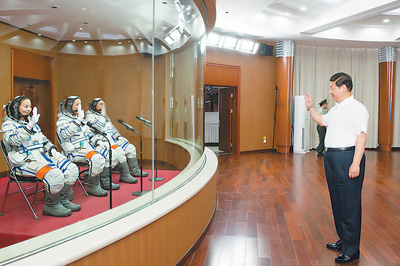 聶海勝代表3名航天員鄭重表示,感謝習(xí)主席,感謝黨和人民的關(guān)懷。我們一定服從命令,聽從指揮,沉著冷靜,精心操作,圓滿完成神舟十號任務(wù)。請首長放心,請祖國和人民放心。