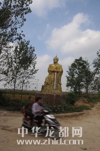 ????宜路鎮岳莊行政村的中心位置有一座醒目的岳飛塑像,近6米高,是今年3月建成的,出資修建岳飛塑像的是村里一所私立學校的校長岳恒飛。