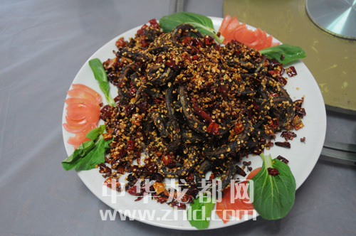 ????到了孫店鎮(zhèn),不吃“干煸盤龍鱔”是種遺憾。這里的“干煸盤龍鱔”不僅選料考究,而且做工精細(xì)。鱔魚(yú)必須選擇顏色呈黑褐色的天然生黃鱔,辣椒以紅色為宜。做法要經(jīng)過(guò)泡、燙、炸、煸炒等工序。“干煸盤龍鱔”具有極高的營(yíng)養(yǎng)價(jià)值和藥膳作用。“辣而不膩、麻而可口!”記者品嘗了剛做好的“干煸盤龍鱔”,發(fā)現(xiàn)風(fēng)味果真獨(dú)特。