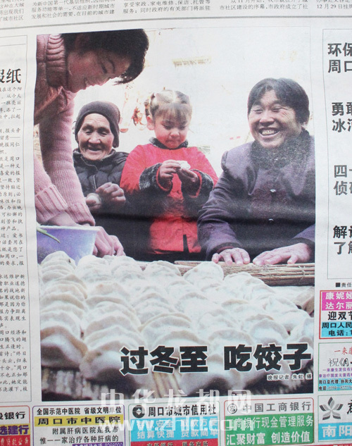 ????創(chuàng)刊號頭版壓軸圖片《過冬至,吃餃子》,拍攝的是80多歲的姥姥、50多歲的媽媽、30多歲的媳婦、五六歲的小女孩四世同堂歡天喜地包餃子的場景。媳婦搟餃子皮,姥姥、媽媽包餃子,五六歲的小女孩也來湊熱鬧,拿起一個餃子皮學(xué)著大人的模樣包餃子,剛剛包好的一大鍋蓋餃子令人垂涎。特別是按照晚報的送報時間,創(chuàng)刊號報紙送到千家萬戶時正好是上午11時之前,此時正是人們包好餃子準(zhǔn)備煮餃子的時間。可想而知,大家一邊品讀屬于周口人自己的晚報、欣賞和諧家庭歡天喜地包餃子的圖片,一邊把包好的餃子下到沸騰的開水鍋里,那煮出的餃子香味和著晚報濃濃的墨香,香飄滿城,沁人心脾。