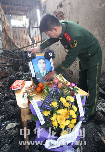 ????正月十五元宵節,人們齊聚在鄭春光犧牲的那間不大的商鋪門前,在那間已經被熏黑的墻壁上掛上潔白的小花:“鄭春光你是人民的好兒子”、“春光我們永遠懷念你!”、“春光一路走好!”字字真情、句句感動,表達著人們對這位好男兒的無限哀思。人們端來了熱騰騰的湯圓放在鄭春光犧牲的門前,所有的人們面對春光犧牲的地方,為他們心中的英雄深深地鞠了三躬。一位淚流滿面的老人哽咽著:“春光,好孩子,我給你送元宵來了!好孩子,你吃點吧!吃點吧!”在場的人們哭聲一片。