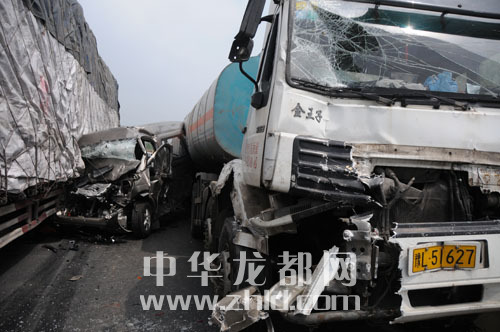 ????現場,20多輛汽車駕駛室嚴重變形。一輛懸掛晉M牌照拉木材的貨車的駕駛室被撞成一團,方向盤甩在4米外的路面上。約2公里長的地面上散落了不少貨物、車窗碎片及大片機油。