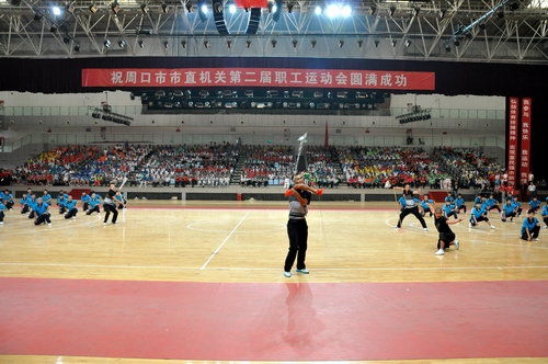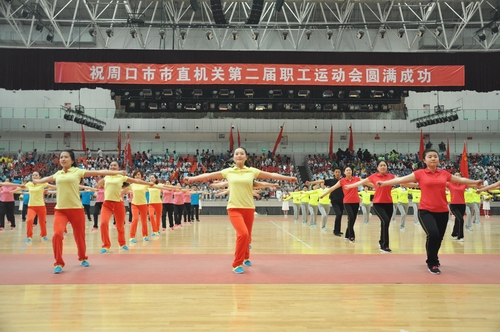 ????開幕式后,由周口市教育局、周口市公路局、周口市直機關事務管理局、周口市直幼兒園四個參賽單位共同表演的第九套廣播體操拉開了文體表演的序幕。周口師范學院推薦的青春健美舞,周口太極協會的太極刀、太極劍、太極扇表演,周口市秧歌協會推薦的中老年健美舞和周口三通武校帶來的精彩武術表演等全民健身項目展演。