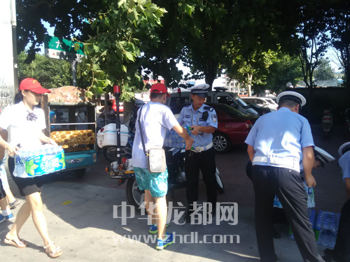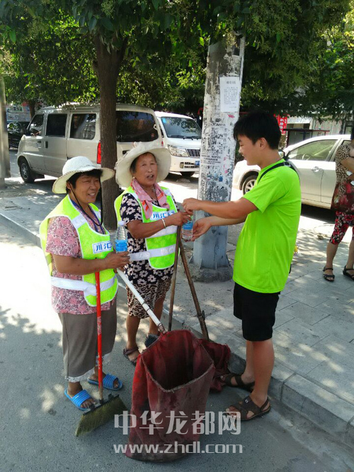 ????又是一年最熱時,在馬路上工作的交警和環衛工可謂備受煎熬。有感于交警和環衛工的辛苦,7月29日,愛心學校和公益機構以送瓶裝礦泉水的方式,向他們表達了自己的敬意。晚報記者 郭坤 張燕 攝