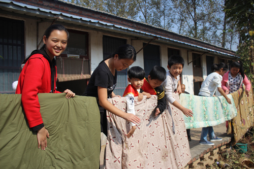 ????上圖:在九九重陽節來臨之際,為弘揚中華民族傳統美德,營造尊老、敬老、愛老、助老的良好風尚,項城市開展了“溫暖重陽·關愛老人”重陽節慰問活動,為敬老院的老人送去了慰問物品,讓老人們感受到社會的關愛和溫暖。圖為該市中小學生在南頓鎮敬老院為老人們晾曬被褥。 張永久 攝