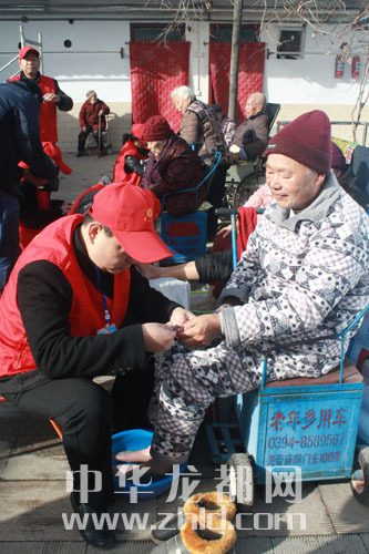 12月2日,十多名來自周口傳德公益愛心QQ群的志愿者來到周口中心城區建設東路附近一敬老院,為這里的老人送來蛋糕、牛奶等慰問品,并為老人理發、洗腳。