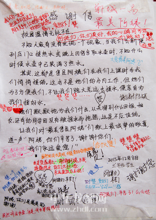 ????不少學生在這封感謝信上留言表達敬意和謝意:“贊”、“給個大贊”、“我是受益者之一,謝謝阿姨為我接滿熱水,你們太好啦”、“阿姨們辛苦了”、“謝謝您”……