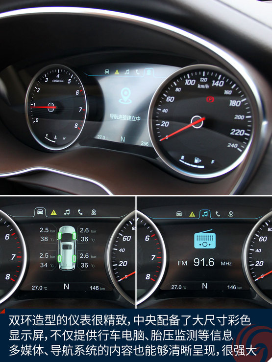 中控臺中央的大尺寸液晶屏顯示效果挺贊,高清屏、亮度高、色彩艷麗,功能上也足夠強大,收音機、藍牙免提、影音播放、GPS導航等等非常全面,前后雷達、360全景影像也能夠在這里清晰顯示,只可惜手機互聯僅支持安卓系統,希望日后能有所完善。下方的自動空調控制區很精致,也很顯檔次。