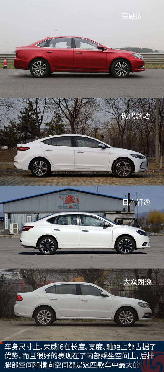 從上面的表格可以看出,榮威i6的長寬高分別為4671*1835*1460mm,在寬度和長度上,都要優于其他三款車。特別是車寬,達到了1835mm,橫向的寬度不僅可以提升視覺效果,對車內橫向空間也影響很大,尤其是后排乘坐3人的時候。在軸距上,榮威i6以2715mm的數據表現,穩居第一位。