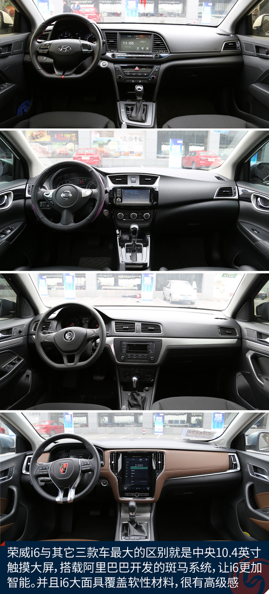 榮威i6內飾軟包比例達到80%,能摸到的地方幾乎都采用了軟性材料,舒適溫馨的車內氛圍也是家庭用戶非??粗氐摹s威i6內飾最大亮點在于10.4英寸的中控屏和和7英寸液晶儀表盤,讓科技感和豪華感超越了另外三款合資車型。相比榮威i6來說,它們的內飾過于老套了。同樣i6的做工也絲毫沒有遜色于對手,在內飾有機物揮發指標上遠低于國家車內空氣質量標準水平。