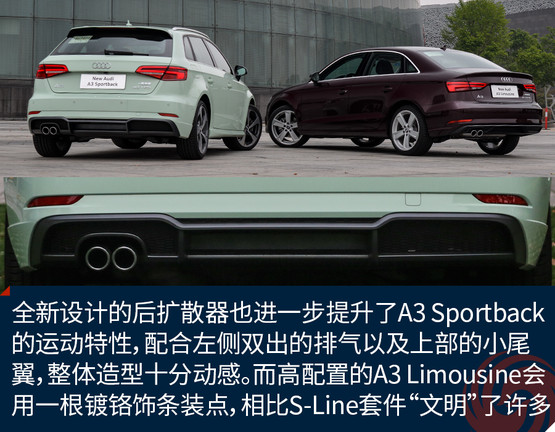 全新設(shè)計的后擴(kuò)散器也進(jìn)一步提升了A3 Sportback的運(yùn)動特性,配合左側(cè)雙出的排氣以及上部的小尾翼,整體造型十分動感。而高配置的A3 Limousine會用一根鍍鉻飾條裝點,相比S-Line套件“文明”了許多。與LED矩陣大燈相呼應(yīng)的是全LED尾燈,兩者相輔相成為新車帶來了更強(qiáng)的攻擊性以及橫向視覺延展性,新加入的流動式轉(zhuǎn)向燈在美觀的同時也提升了整車的科技感。