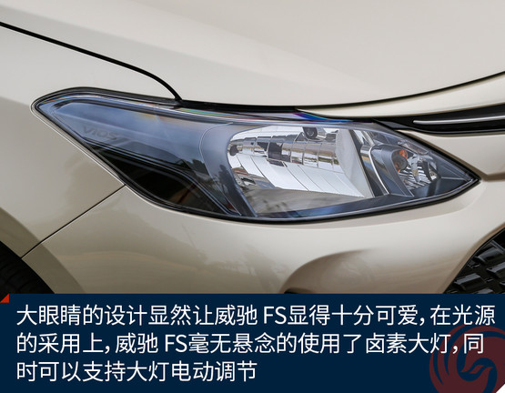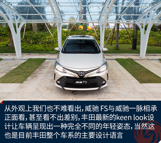 從外觀上我們也不難看出,威馳 FS與威馳一脈相承,正面看,甚至看不出兩車的差別,豐田最新的keen look設計讓車輛呈現出一種完全不同的年輕姿態,當然這也是目前豐田整個車系的主要設計語言,就是要讓車輛更顯年輕運動。大嘴的設計讓威馳 FS頗顯得有些頑皮,而且在這張大嘴中還隱藏了許多四邊型的裝飾塊,在大嘴兩側是兩道裝飾性的“八字胡”,除此之外是一雙大大的眼睛,這一副調皮可愛的模樣,相信不少年輕人都會喜歡。