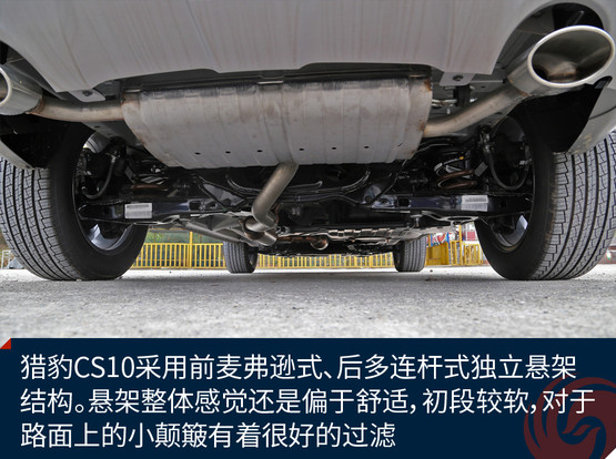 獵豹CS10采用前麥弗遜式、后多連桿式獨(dú)立懸架結(jié)構(gòu),相比同級(jí)別扭力梁車型多多少少提升了一定的操控感。懸架整體感覺還是偏于舒適,初段較軟,對(duì)于路面上的小顛簸有著很好的過(guò)濾,在彎中的支撐力也較有韌性,過(guò)彎時(shí)的側(cè)傾控制的比較不錯(cuò)。