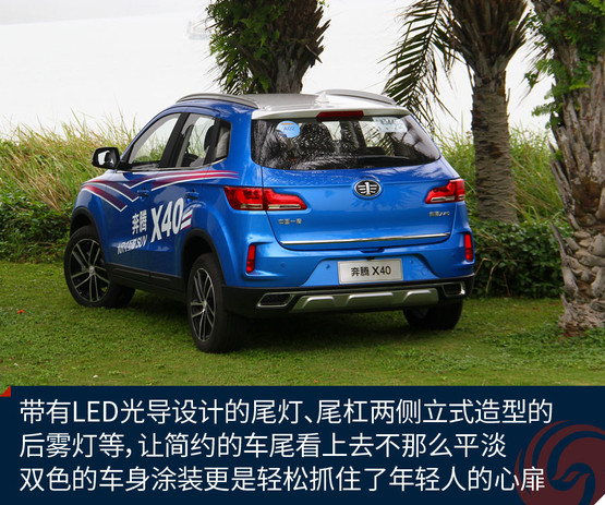 奔騰X40定位于一款小型SUV,雖然家族式的六邊形格柵線條依然有點生硬,但頗具馬自達神韻的大燈、帶有京劇臉譜線條的前臉、時尚前衛的雙色車身等,都讓它向目前大家更看重的顏值路線更近一步。能在第一眼抓住年輕人的心,這款車就成功了一半。