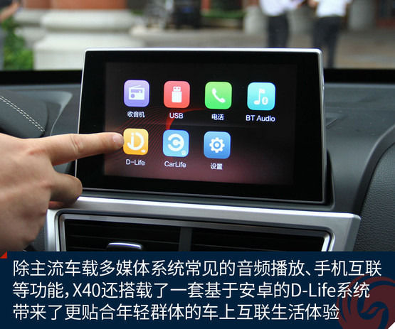 不過跟奔騰X40接觸兩天之后,會發現它大可不必在對手林立的市場中血拼顏值,靠實力不俗的獨門絕技一樣能夠輕松獲得一席之地。既然面向年輕用戶,豐富的車載娛樂系統很關鍵。大屏幕、手機互聯等等似乎已經是這類車的標配。奔騰X40更進一步,所搭載的D-Life系統讓我們看到了它引領潮流的勁頭。