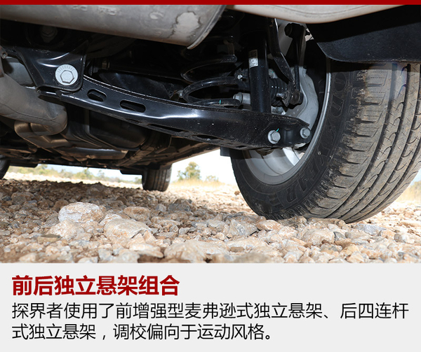 探界者的底盤受到雪佛蘭運動傾向的影響,被調校的有些偏硬,這樣對于車身側傾的抑制就非常到位,面對路面上連續的起伏,緊致的懸架也帶來很強的整體感。但是當面對較大的顛簸或者減速帶一類的時候,車身就會產生彈跳的感覺,而且懸架的回彈稍有延遲,總有一次小幅度的二次彈跳,稍稍影響了舒適性。