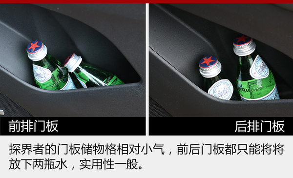 探界者作為一臺中型SUV在儲物空間的表現其實有些平庸,不算多的儲物格除了扶手箱以外基本沒有亮點,而且門板的儲物格也比較不實用;后備箱的空間倒是值得肯定,無論是座椅放倒后的平整和可擴展性,還是蓋板下方的小儲物格,都很靠譜。