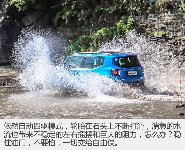 我從來也沒想過渡河是一件多么有樂趣的事兒,然而其實(shí)也挺危險(xiǎn)的。水看著不是很深,但一下到水里就感覺坐進(jìn)了船,漂在水上,湍急的水流沖的車身不斷輕微的搖擺,水中行車的阻力也很大,河底和河床上還遍布著大石頭,開著車就不斷的左左右右上上下下的顛簸著,不過只要穩(wěn)住油門,其實(shí)很輕松。后悔提前拆了頂棚,看著車身兩側(cè)濺起的水花,很爽,也很濕。
