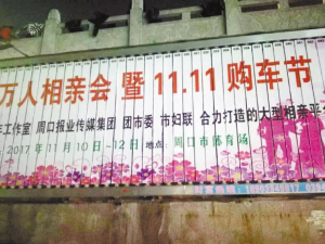 ????據了解,周口萬人相親會是由市委組織部青年工作辦公室、共青團周口市委、市婦聯、周口報業傳媒集團聯合主辦的大型相親平臺。為再一次給廣大消費者搭建更好的選車、購車平臺,周口報業傳媒集團決定于11月10日至12日在市體育場隆重舉辦2017周口萬人相親會暨“雙十一”購車節。
