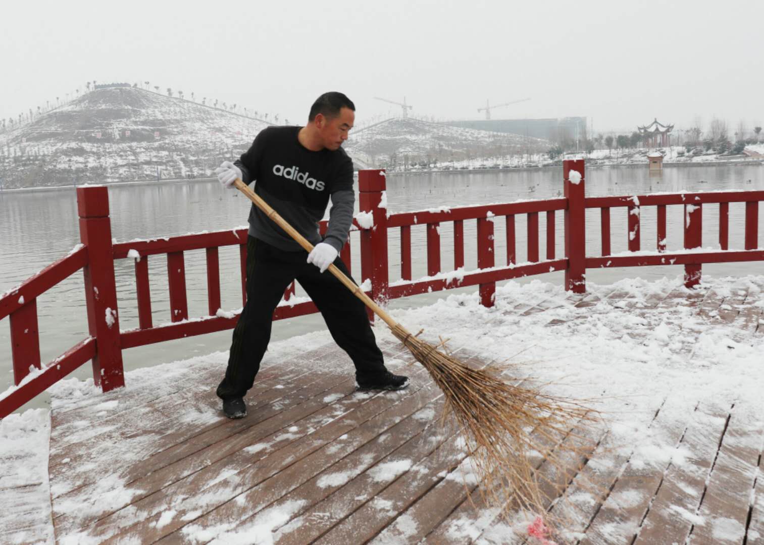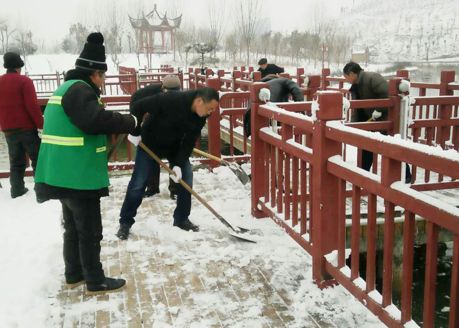 經過兩場大雪的洗禮,空氣格外清新,但鹿邑上清湖公園內積雪嚴重,且已結冰,給市民游園帶來了諸多不便和隱患。從早晨到下午4點半,鹿邑市政園林中心的干部職工和道德公益志愿者在上清湖集合后,投入鏟雪掃雪行動,經過一天的緊張清掃,上清湖湖面棧道和園內公路上的積雪清掃一遍。道德公益志愿者鐘華在微信群里提出建議后,有十幾位志愿者報名參加上清湖義務掃雪活動。