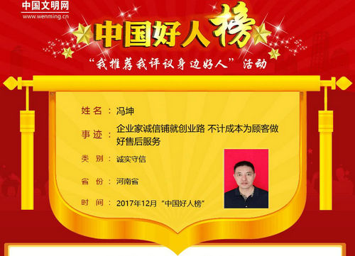 馮坤,男,中共黨員,1974年8月生,河南省周口市太康縣張集鎮(zhèn)人,就職于河南省四通鍋爐有限公司?!按艘姓\(chéng)意,做事要講誠(chéng)信,做事要先把人做好。”是馮坤創(chuàng)業(yè)成功的秘訣,就是誠(chéng)信。