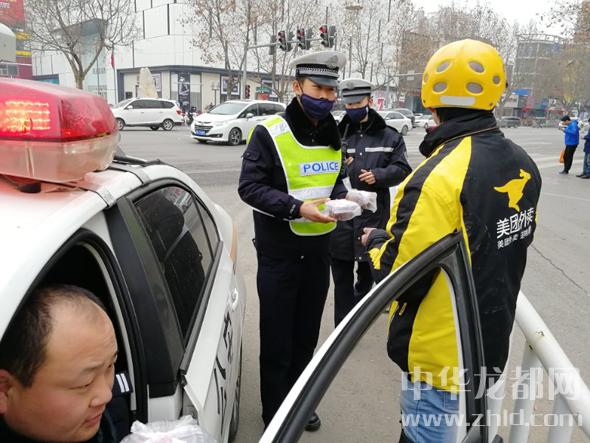 1月24日,在寒風中執勤的市公安局交通警察管理支隊直屬一大隊的交警收到美團外賣送來的臘八粥。