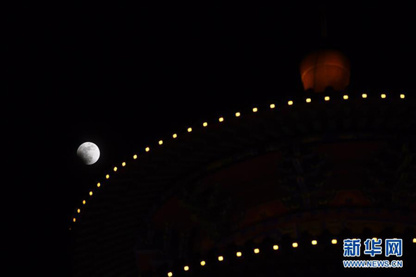 這是1月31日在北京宣武門地區(qū)拍攝的月亮升起時的場景。當日是丁酉雞年最后一個滿月夜,天空中上演月全食大戲。我國大部分地區(qū)都能欣賞到一輪“紅月亮”高懸夜空的迷人景象。新華社記者 邢廣利 攝