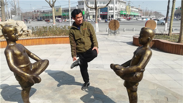 在表現兒童游戲“斗雞”的雕塑前,兩個光背孩童獨腿站立,分別搬著另一條腿作戰斗準備。那生動的畫面,令40多歲的市民尚巖青忍俊不禁,他也獨腿站在雕塑中間,像個開心的孩子一樣,搬著腿和雕塑中的頑童組成一起斗雞的場景。