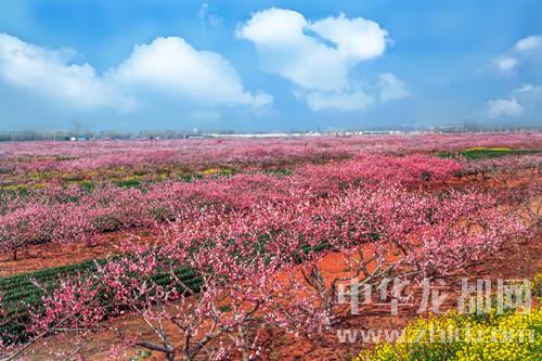 萬畝桃園位于黃橋鄉(xiāng)裴莊村。該村在改革開放前,每人每年只能收獲幾十斤糧食。實行聯(lián)產(chǎn)承包責(zé)任制后,這個村依然是“麥茬豆,豆茬麥,改茬就把紅薯栽”。到了1986年底,該村的吳新躍、吳新民、吳新生等6戶村民再也坐不住了,聚在一起商量如何改變傳統(tǒng)的種植模式。最后他們決定在自家責(zé)任田種植桃樹。3年后,6戶村民種的桃樹掛果了,當年每戶收入超過2000元。群眾看種植桃樹有利可圖,紛紛效仿,于是以裴莊村為中心的桃樹種植面積越來越大。到2005年,全鄉(xiāng)桃樹種植面積發(fā)展到萬余畝,形成了“春季花滿園,秋季果飄香”的人間仙境。