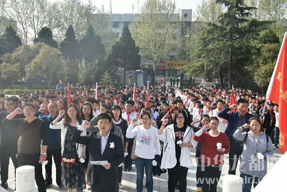 上午八點半,400余名學生衣著整潔,佩戴紅領巾,手握自備白花,排著整齊的隊伍從學校出發,懷著對烈士無限崇敬的心情來到周口烈士陵園,佇立在傲然聳立的烈士紀念碑前,莊嚴肅穆的悼念活動開始了。升國旗、唱國歌、敬隊禮,黨員教師在烈士紀念碑前重溫入黨誓詞,少先隊員代表向烈士墓敬獻花圈,全體師生向烈士鞠躬默哀。