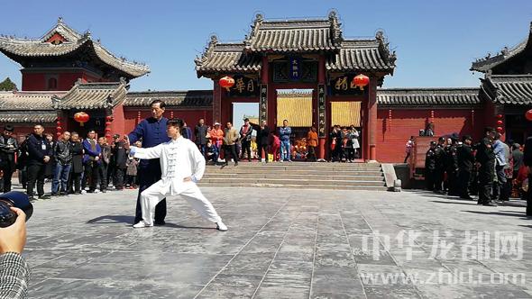 研討會前,王西安大師率弟子在淮陽太昊陵廟太極門前向海內外太極拳愛好者傳授拳術。