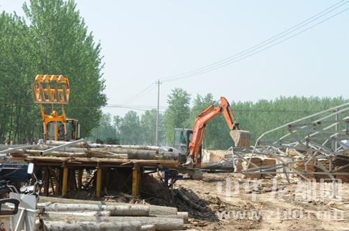 中華龍都網訊(周口報業全媒體記者 張勁松 通訊員 蘇千 文/圖)4月18日,東新區城管中心在該區國土局、許灣鄉政府的配合下,出動執法人員120多名,執法車輛10輛,對許灣鄉程寺行政村6處違法占地、違章建設進行強制拆除。