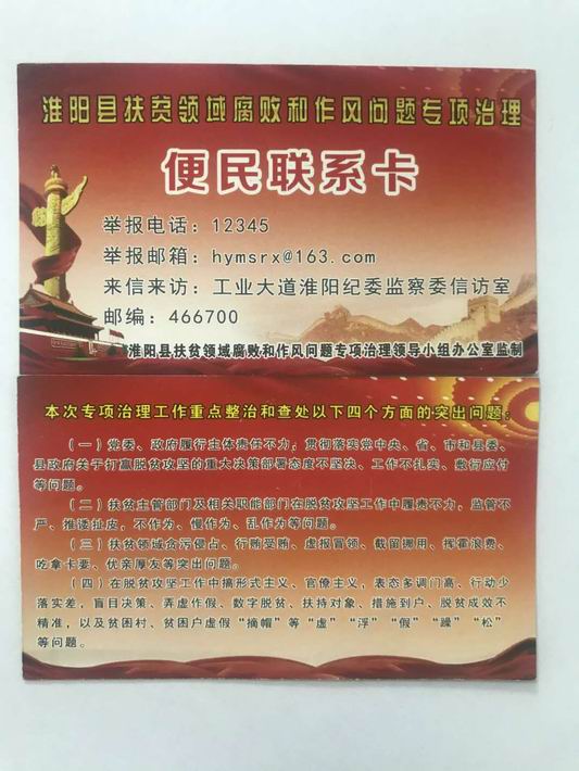 今年4月,淮陽縣扶貧領域腐敗和作風問題專項治理全面啟動。為確保專項治理取得實效,縣紀委監委印制發放“便民聯系卡”,進一步加大宣傳力度,暢通信訪舉報渠道。他們統一制作的扶貧領域腐敗和作風問題專項治理便民聯系卡,上面印有專項治理工作重點整治和查處的4個方面內容。具體包括黨委、政府履行主體責任不力,脫貧攻堅工作不扎實,敷衍應付;扶貧部門及相關職能部門脫貧攻堅工作中不作為、慢作為、亂作為等;扶貧領域發生貪污侵占,虛報冒領,截留挪用等問題。聯系卡公布了舉報電話和來信來訪地址,方便群眾對黨員干部和部門的監督。