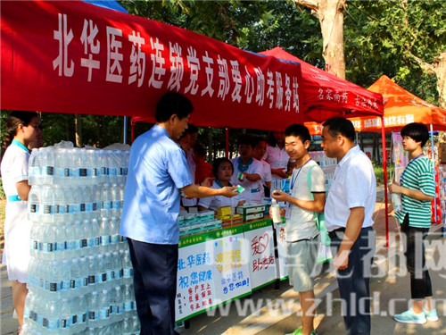 愛心助考活動現場,西華縣真愛醫院黨支部設立的“黨旗引領、護航高考”的大紅愛心助考條幅分外惹眼,黨員志愿者們免費為考生提供藿香正氣水、風油精、退燒藥等,并有醫護人員現場提供急救服務。在西華縣恒生醫院黨支部愛心助考點前,3名醫護人員正在免費為考生及家長提供風油精、清涼油、仁丹、藿香正氣水等防暑降溫藥品和急救藥品,還有擔架、120急救車輛等。西華縣北華醫藥黨支部愛心助考服務站的黨員志愿者,正在向考生免費提供防暑降溫藥、感冒發燒藥、拉肚子藥等藥品。黨員志愿者愛心企業代表宋女士說:“在高考期間,我們為考生及家長免費提供礦泉水、芭蕉扇、清涼油等多項服務,除了愛心,更多的是一份責任和使命。”