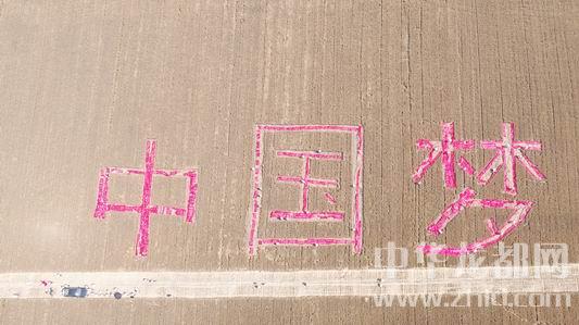 記者在現(xiàn)場(chǎng)看到,“中國(guó)夢(mèng)”三個(gè)字每個(gè)字高約30米,寬約23米,間隔約10米,筆畫寬約2米。為了讓字跡突出,他們把以前懸掛宣傳標(biāo)語的廢棄紅布條,鋪在麥茬上。一片金黃中,紅艷的字體格外奪目。