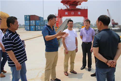 當天上午,宿遷市港口發展有限公司董事長尤勇、江蘇連云港灌河港國際港務有限公司副總經理鄒平海攜公司人員來到周口中心港碼頭,尤勇、鄒平海一行首先參觀中心港碼頭4#5#港池,周口中心港碼頭運營辦主任段傳奇向他們詳細介紹了碼頭運營現狀、吊裝設備使用情況、圍繞周口中心港打造的多式聯運建設進度和長遠規劃。