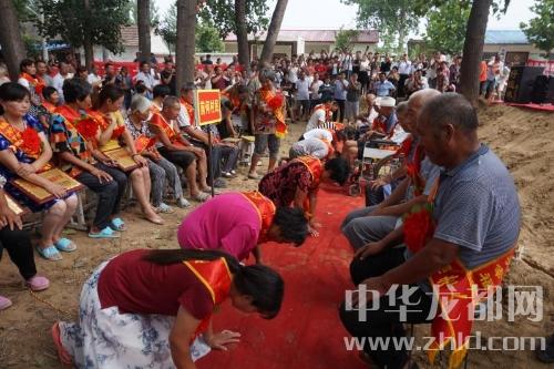 儀式上宣布了對(duì)前何行政村31戶孝老愛(ài)親之家進(jìn)行表彰的決定,并為他們頒發(fā)了“馬廠鎮(zhèn)孝老愛(ài)親之家”牌匾。在《愛(ài)的奉獻(xiàn)》樂(lè)曲伴奏下,31個(gè)孝老愛(ài)親之家的孝順兒子、孝順兒媳婦向自己的父母行跪拜之禮。