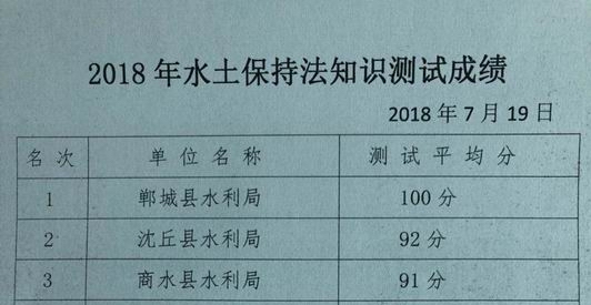 7月20日,一份周口市“2018水土保持法知識測試成績單”傳到鄲城縣水利局,該局以100分的優異成績榮獲全市第一名。