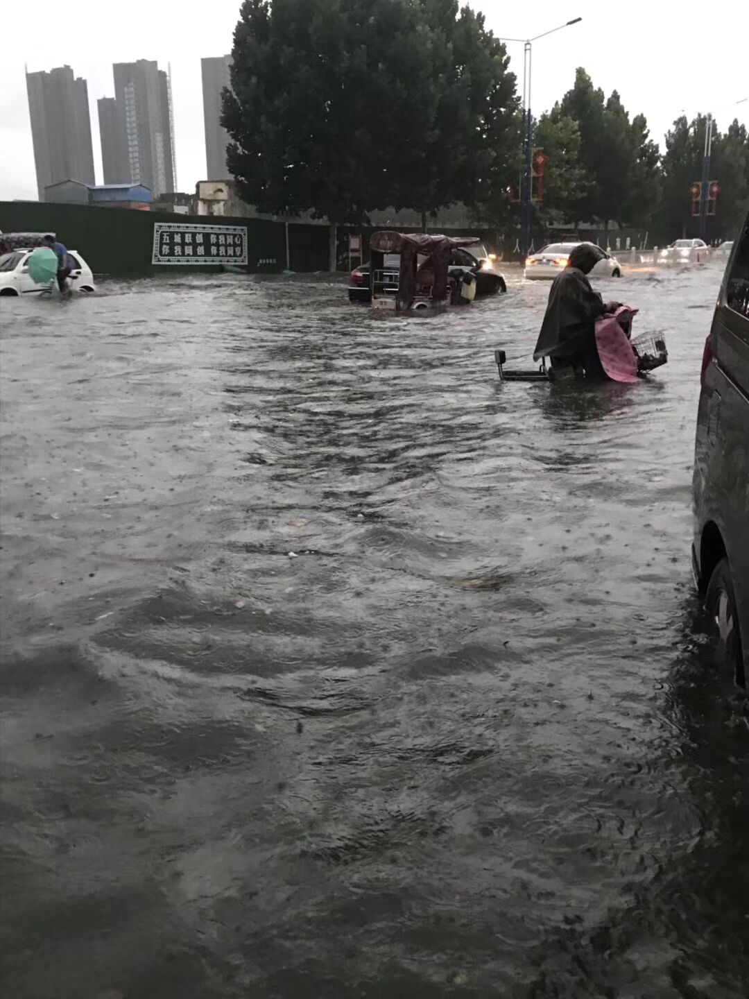記者在周口市東新區觀察到,降水從26日下午4點多開始,一直持續到夜間,其間伴有雷電和大風。26日傍晚6時許,記者在周口市文昌大道看到,積水嚴重的地方已經淹沒了自行車大半個輪胎,一些行人涉水而行,車輛則猶如沖浪前進。
