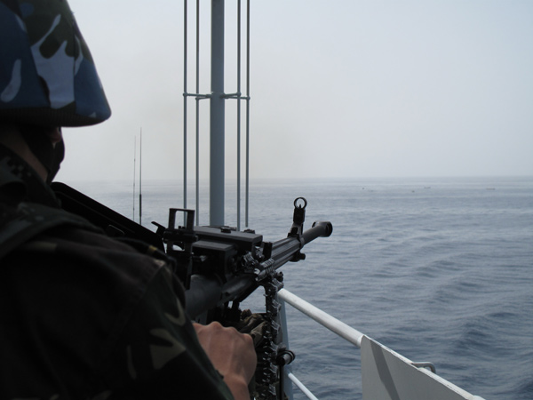 “噠噠噠……”,特戰隊員扣動扳機,重機槍發出猛烈的怒吼,呼嘯而出的子彈在海盜快艇前筑起一道難以逾越的火線,海盜見狀,頓時慌了手腳,急忙調轉船頭,倉皇逃竄。