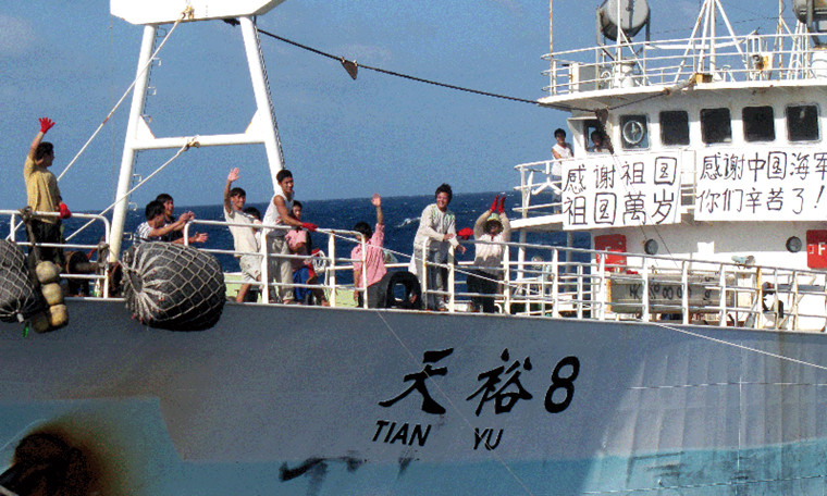 看到海口艦,“天裕8號”船員就像見到了久違的親人,紛紛走上甲板,歡呼著向海口艦揮手致意,并在船上升起一面鮮艷的五星紅旗。他們年齡大約在二十歲左右,在甲板上行走如飛,如履平地一般。