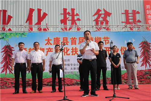 8月22日,太康縣首屆辣椒節(jié)暨辣椒產(chǎn)業(yè)化扶貧基地現(xiàn)場會(huì)在龍曲鎮(zhèn)紅云來辣椒產(chǎn)業(yè)扶貧基地召開。太康縣人大副主任、黨組副書記竇勝利,縣政府副縣長張國慶,縣公安局局長李根闖等領(lǐng)導(dǎo)和相關(guān)人員出席會(huì)議。竇勝利宣布開幕,張國慶講話并致辭,會(huì)議由龍曲鎮(zhèn)黨委書記趙云華主持。