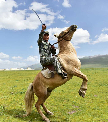 盛夏的巴塘草原,天藍草綠,戰馬嘶鳴。不遠處的開闊地上,豎著7個高低不同的靶標。隨著連長王育龍一聲令下,駕著“頭馬”的上士趙雪超高聲長嘯揚鞭策馬疾馳,他利落地拔出馬刀,左刺右劈,刀起靶落,一整套動作一氣呵成,彪悍十足。近距離觀摩課目示范的騎兵連新兵一個個驚呼“開了眼”,都說從趙班長身上看到了影視劇里蒙古鐵騎的影子。