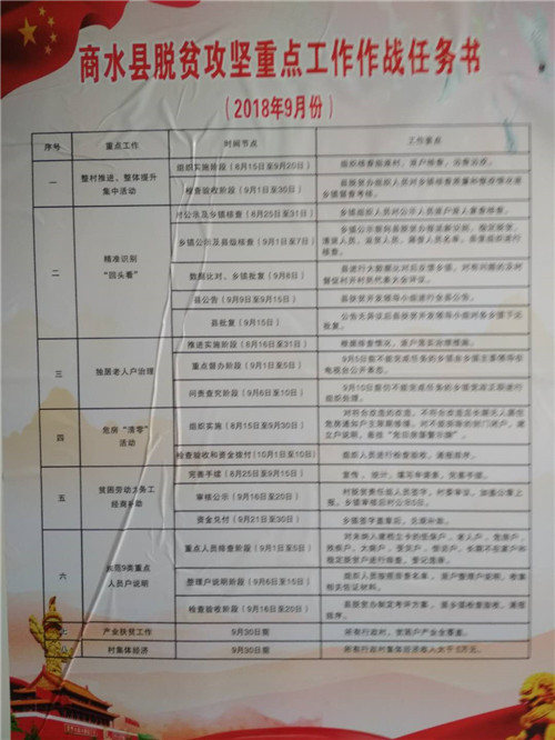 “‘脫貧攻堅重點工作作戰(zhàn)任務(wù)書’既是作戰(zhàn)圖、也是軍令狀,每個時間點開展哪些工作、達到什么效果、采取何種措施,都在‘作戰(zhàn)任務(wù)書’上顯現(xiàn)了出來。”9月5日上午,商水縣練集鎮(zhèn)朱集村脫貧責(zé)任組組長陳書敬指著張貼在村辦公室內(nèi)的“商水縣脫貧攻堅重點工作作戰(zhàn)任務(wù)書”說。