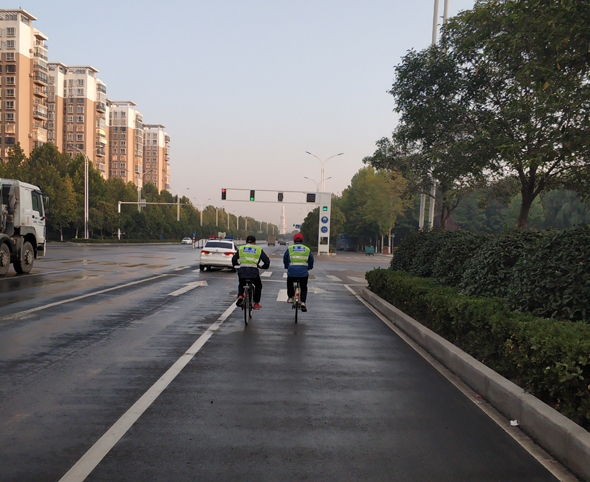 10月3日6時,國際級丈量員、吉林體育學院教授袁林受中國田徑協會委派,與周口馬拉松組委會工作人員一起,對周馬新調整的賽道進行精準丈量。