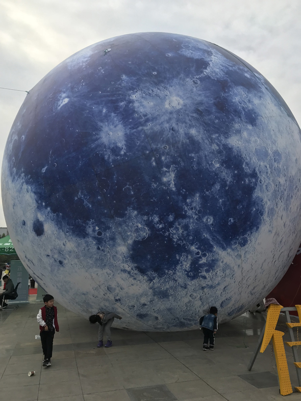 記者在現場看到,這個“大月亮”塊頭很大,擺放在展廳前。前來參加展會的市民紛紛拍照,有的市民還把它發到微信朋友圈,稱“周口有個超級大月球”。