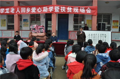 雖然身在北京,但于學(xué)龍老人的心始終牽掛著故鄉(xiāng)。11月5日,他回到老家商水縣黃寨鎮(zhèn),用自己的退休金,為母校埠口小學(xué)的孩子送來一批嶄新的書包和自己創(chuàng)作的書法精品。“親愛的小校友們,你們背上書包上學(xué)就更方便了,希望你們好好學(xué)習(xí)、茁壯成長,將來成為社會棟梁,報效國家。”于學(xué)龍對孩子們說。