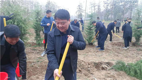 當天下午雖然暖陽照射,但初冬的鹿邑大地仍是涼風習習。不過這一點兒也沒有影響到大家的心情。一到植樹現場,梁建松、李剛等領導就和大家一起興致勃勃地拿起鐵鍬等工具忙碌起來,揮鍬鏟土,扶樹填土,澆水正苗,每道工序都做得認真細致、一絲不茍。