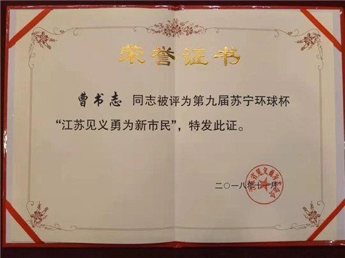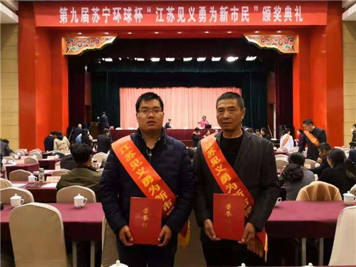 11月14日,江蘇省見義勇為基金會(huì)第九屆蘇寧環(huán)球杯“江蘇見義勇為新市民”頒獎(jiǎng)典禮在南京舉行,來(lái)自河南省項(xiàng)城市新橋鎮(zhèn)的農(nóng)民工曹書志獲此殊榮。