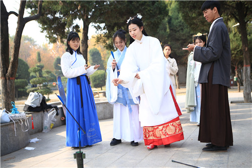 11月25日,周口的漢服同袍以“漢服出行,不忘初心”為主題自發相約在人民公園、五一廣場等地向行人宣傳漢服文化。